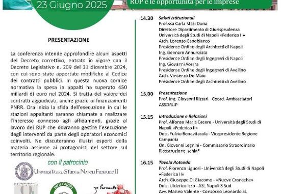 Il Consiglio dell’Ordine degli Architetti Pianificatori Paesaggisti e Conservatori di Avellino ha concesso il proprio patrocinio alla Conferenza Regionale della Campania dal titolo: “Il correttivo al Codice dei contratti: le sfide delle stazioni appaltanti, il ruolo dei RUP e le opportunità per le imprese”, promossa dall’associazione ASSORUP. L’iniziativa si terrà lunedì 23 giugno, a partire dalle ore 14:30, presso l’Aula De Sanctis dell’Università degli Studi di Napoli Federico II (Corso Umberto I, n. 40). L’evento rappresenta un’importante occasione di approfondimento sul Decreto legislativo 209/2024, che introduce correttivi al Codice dei contratti pubblici, e sulle nuove sfide operative poste alle stazioni appaltanti, chiamate a gestire con efficacia e trasparenza una mole di investimenti pubblici che, solo nel 2024, ha superato i 450 miliardi di euro, anche grazie ai fondi del PNRR. Al centro dei lavori, il ruolo strategico dei RUP (Responsabili Unici del Procedimento), l’impatto delle nuove normative sulle imprese e il confronto tra soggetti pubblici, mondo accademico e professionisti del settore.