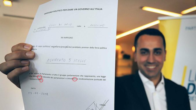 “Io sottoscritto – si legge nel documento ambiziosamente intitolato Impegno politico per dare un governo all’Italia – mi impegno a far votare […] una legge che dimezza le indennità dei parlamentari e introduce la rendicontazione puntuale dei rimborsi spesa.” Con due indicativi là dove invece la lingua italiana richiederebbe due congiuntivi, dimezzi e riduca.