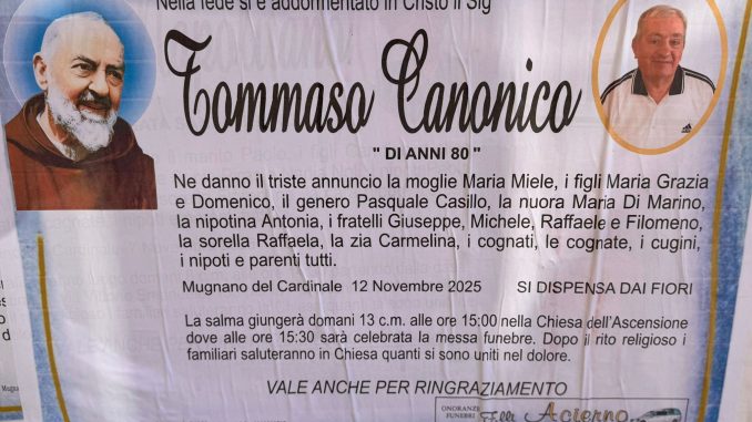 MUGNANO DEL CARDINALE – La comunità mugnanese piange la scomparsa di Tommaso Canonico, spentosi all’età di 80 anni. La notizia, diffusa dai familiari attraverso il manifesto funebre affisso in paese, ha destato profonda commozione tra quanti lo conoscevano e stimavano.