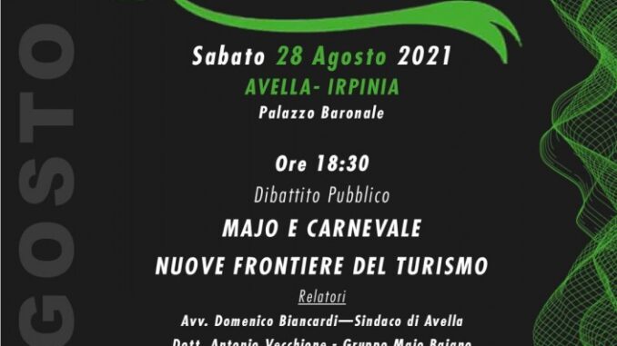Sabato 28 agosto “Made in Irpinia” farà tappa ad Avella, presso il Palazzo Baronale, dove alle ore 18.30 si svolgerà il dibattito pubblico, moderato da Roberto D’Agnese, sul tema “Majo e Carnevale: nuove frontiere del turismo”. Interverranno Domenico Biancardi, sindaco di Avella e presidente della Provincia, Antonio Vecchione, Gruppo Majo Baiano, Nicola Montanile, già direttore della Biblioteca di Avella, Mario Cerchione, presidente Zeza di Mercogliano, Michele Amato, Pro loco Clanis.