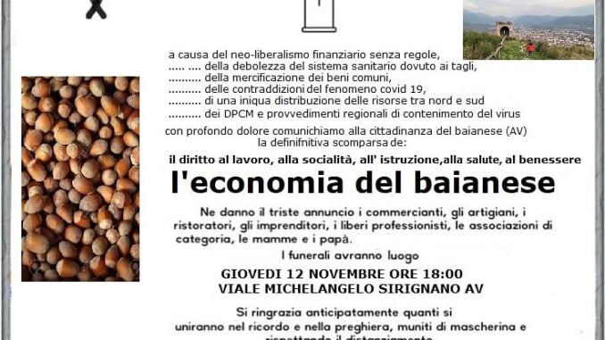 Protesta pacifica del popolo del baianese giovedì 12 novembre ore 18.00 viale Michelangelo, Sirignano. Con le nuove misure adottate dal Governo e dal Governatore della Campania la domanda che tutti ci siamo posti è stata: Quando arriveranno gli aiuti e i sostegni alle famiglie e ai lavoratori in difficoltà? Dopo 8 mesi per adeguare il Paese a una seconda ondata, hanno di nuovo costretto milioni di lavoratori a bloccarsi per la loro incompetenza.