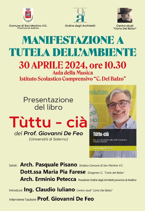 Si svolgerà martedì 30 aprile alle ore 10.30 presso l’Aula della musica dell’Istituto Carlo Del Balzo di San Martino Valle Caudina la “Manifestazione a tutela dell’Ambiente” patrocinata dall’ordine degli architetti della provincia di Avellino per l’ iniziativa voluta dal Centro Studi Carlo Del Balzo e promossa dal Comune di San Martino Valle Caudina. Nel corso dell’evento sarà presentato il libro “Tùttu – cia” del professore Giovanni De Feo dell’Università di Salerno. Parteciperanno il Sindaco di San Martino V.C. Pasquale Pisano, la dirigente scolastica Maria Pia Farese, il presidente degli architetti irpini Erminio Petecca. Introdurrà l’incontro Claudio Iuliano del Centro Studi Carlo Del Balzo. Interverrà nel corso della manifestazione l’autore del libro.