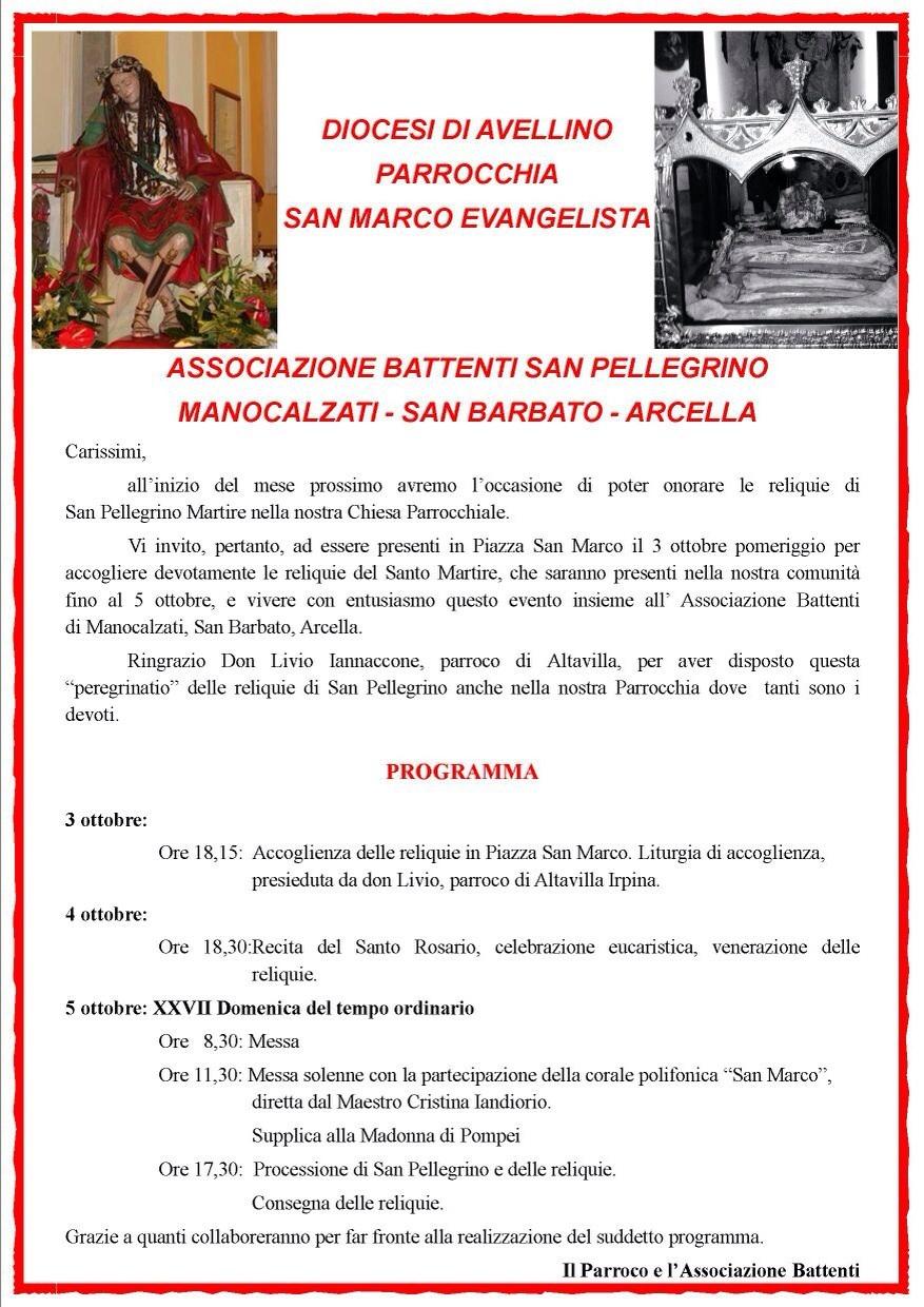 Manocalzati in festa per l’arrivo delle reliquie di San Pellegrino Martire, previsto per oggi pomeriggio 3 ottobre 2014, alle ore 18.00. Per la prima volta la comunità manocalzatese, particolarmente devota al Martire romano, potrà venerare il sacro ossame di San Pellegrino. Ad accogliere, con fede, le reliqiue del Martire Pellegrino, ucciso in Roma, al tempo dell’imperatore Commodo nell’anno 192 d.C. vi sarà il parroco Don Mario Cella, l’intera comunità e la locale associazione battenti di San Pellegrino. Quest’ultimi, particolarmente devoti del Santo, infatti, il 24 agosto di ogni anno, si recano in pellegrinaggio, presso il Santuario di Altavilla Irpina, dove riposano le sacre spoglie di San Pellegrino, martirizzato dall’imperatore Commodo perché non volle abiurare al suo credo cristiano. Le spoglie mortali di San Pellegrino resteranno nella collegiata di San Marco Evangelista di Manocalzati sino a domenica 5 ottobre 2014, quando dopo una solenne processione, per le strade del paese, saranno ricondotte nel Santuario di Altavilla Irpina, dove furono traslate nel 1780, su concessione di Papa Pio VI, per volere di Padre Giuseppe Maria Crescitelli, Maestro Provinciale dell’ordine dei Servi di Maria Addolorata in Monteoliveto di Napoli.