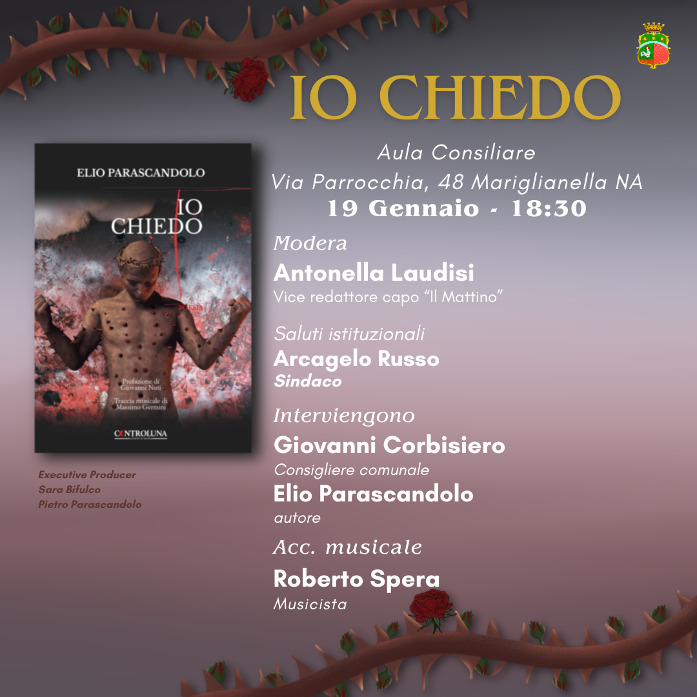 La presentazione del giovane poeta Elio Parascandolo, autore del libro, si terrà Venerdì 19 Gennaio a partire dalle ore 18:30, presso l’aula consiliare del Comune di Mariglianella. Moderatrice dell’evento sarà la giornalista e vice redattore capo de “Il Mattino” Antonella Laudisi, e vedrà la partecipazione speciale del Sindaco Arcangelo Russo, che fornirà il suo saluto istituzionale e del consigliere Giovanni Corbisiero. Accompagneranno i versi del poeta, le liete note del chitarrista Roberto Spera. Ad organizzare la serata, voluta fortemente non solo dal consigliere Corbisiero, e dall’assessorato tutto, ma anche grazie all’intervento speciale di Sara Bifulco, organizzatrice e promotrice della serata e di Pietro Parascandolo.