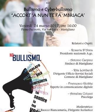 L’I.C.S. “A. Pacinotti” e l’A.ge. di Marigliano presentano, domani venerdì 24 marzo alle ore 17.00, un seminario informativo per docenti e genitori. Il tema centrale dell’incontro sarà il Bullismo e Cyberbullismo due piaghe della società odierna, un’ informazione in primis per le famiglie e gli insegnati che con autorevolezza e non autoritarismo sono i primi a dover indirizzare i giovani sin da piccolissimi verso il rispetto reciproco per qualsiasi altra specie vivente al mondo. Diversi i relatori che interverranno per gridare “no al bullismo”: Rosaria D’anna, Presidente nazionale A.ge.; Antonio Carpino Sindaco di Marigliano; Rita Lombardi Dirigente Ufficio Servizi Sociali del Comune di Marigliano; Francesco Giobbe Esperto in comunicazione digitale; Annalisa Colucci Psicologa. A moderare i lavoro la prof.ssa Ruocco Biancamaria, Dirigente Scolastico dell’istituto Pacinotti. La redazione di Bassa Irpinia vi invita a partecipare a quest’informazione libera, interessante e utile che vede protagonisti noi ed i nostri familiari nel quotidiano spesso impreparati alle varie vicende; vi invita inoltre a riordare che: “L’ignoranza delle persone è tale da non capire che non è deridendo gli altri che si diventa migliori”. Alessia Conte