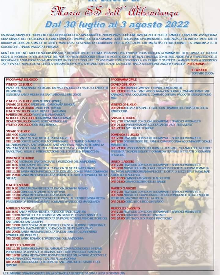 Dopo Visciano è la volta di Marzano di Nola dove si festeggia la Madonna dell’Abbondanza venerata nel maestoso Santuario che sorge sulla collina del Vallo di Lauro e confinante con Visciano dove si è appena festeggiata la Madonna del Carpinello. Anche qui luminarie caratteristiche di stile napoletane, bande musicali e fuochi pirotecnici. La processione della Madonna si svolge in due giorni. Viene prima portata in parrocchia San Trifone dal Santuario è qui venerata durante la festa. Qui è tradizione che il lunedì della festa di Visciano appena conclusa giungono i Battenti per rendere omaggio alla Madonna definita una “Sorella” con Santa Maria a Parete di Liveri festeggiata a maggio.