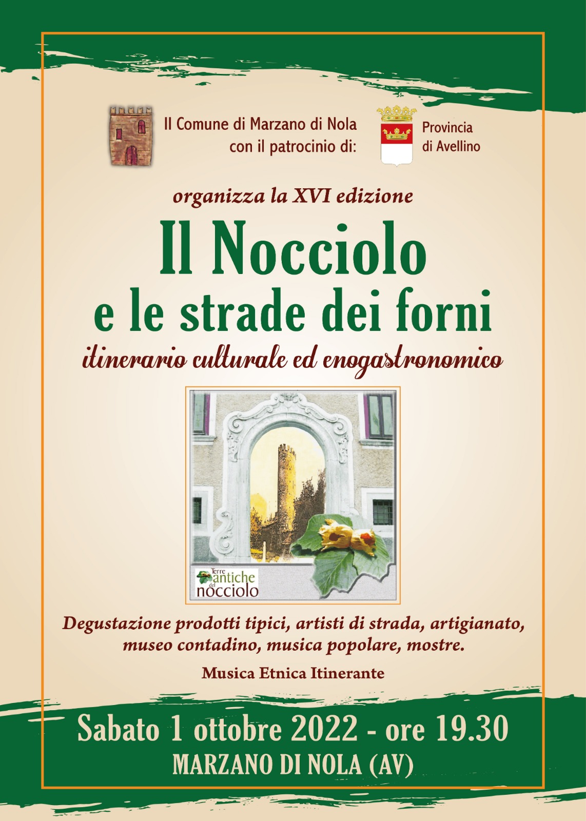Appuntamento a Marzano Di Nola, provincia di Avellino, dove, sabato 1 ottobre a partire dalle 19.30 sarà in programma la 16esima edizione ”Il Nocciolo e le strade dei forni” organizzata dal Comune di Marzano Di Nola con il patrocinio della Provincia di Avellino.
