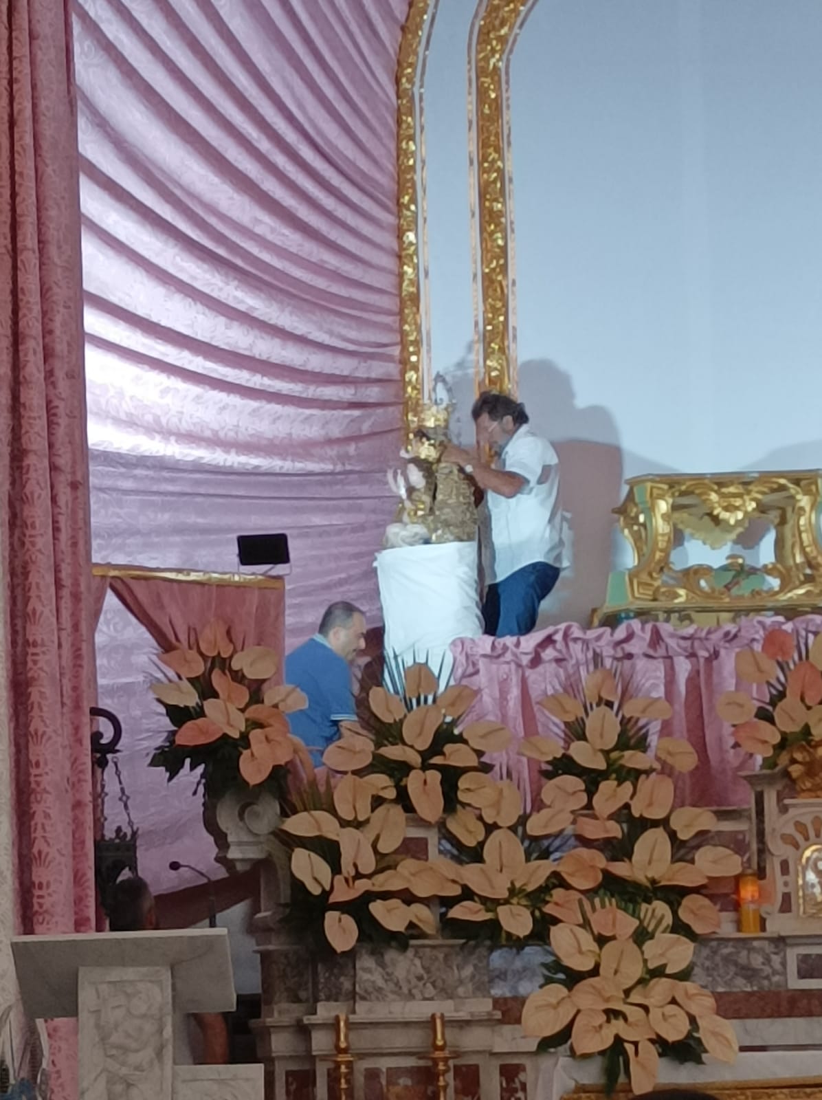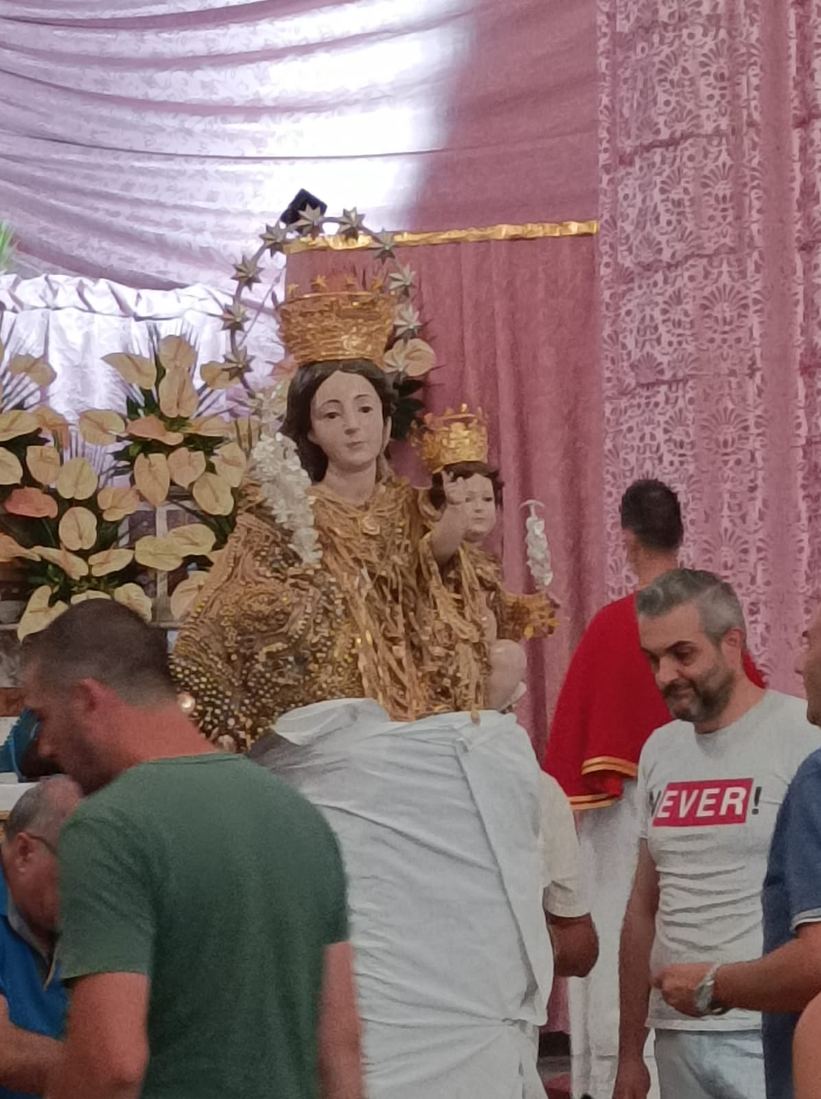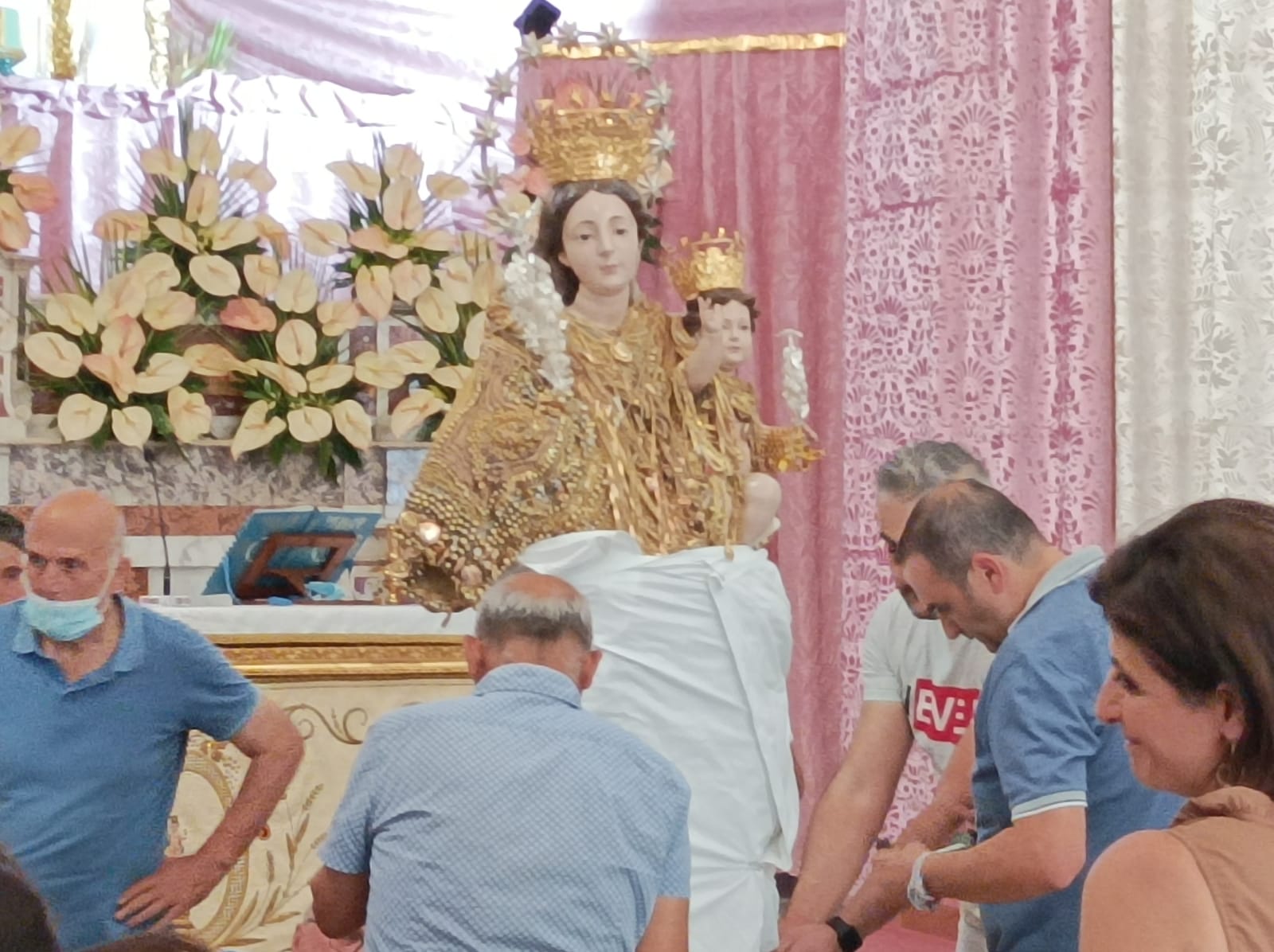 Si è svolta stasera a Marzano di Nola la processione di Maria Santissima dell’Abbondanza tutta vestita d’oro. La Statua della Madonna è uscita dalla chiesa di San Trifone ove era stata collocata sabato scorso. Come da tradizione la processione si svolge in quattro giorni: l’ ultimo sabato di luglio Maria Santissima dell’Abbondanza esce dal suo Santuario, preceduta da Sant’Antonio e Sant’Andrea, per strada le va incontro San Trifone. Il lunedì successivo Maria Santissima dell’Abbondanza viene portata per alcune strade del paese, il martedì la processione esce a mezzogiorno e vi partecipano i devoti provenienti da San Giuseppe Vesuviano. Il martedì poi alle 23 si tiene la svestizione ossia vengono tolti gli ex voti d’ oro che ricoprono la statua. Il mercoledì Maria Santissima dell’Abbondanza fa rientro nel Santuario omonimo. Presenti alla processione due bande musicali, le autorità ecclesiastiche, civili e militari oltre gli appartenenti alle varie associazioni ed i fedeli. (L. Carullo) Foto e video