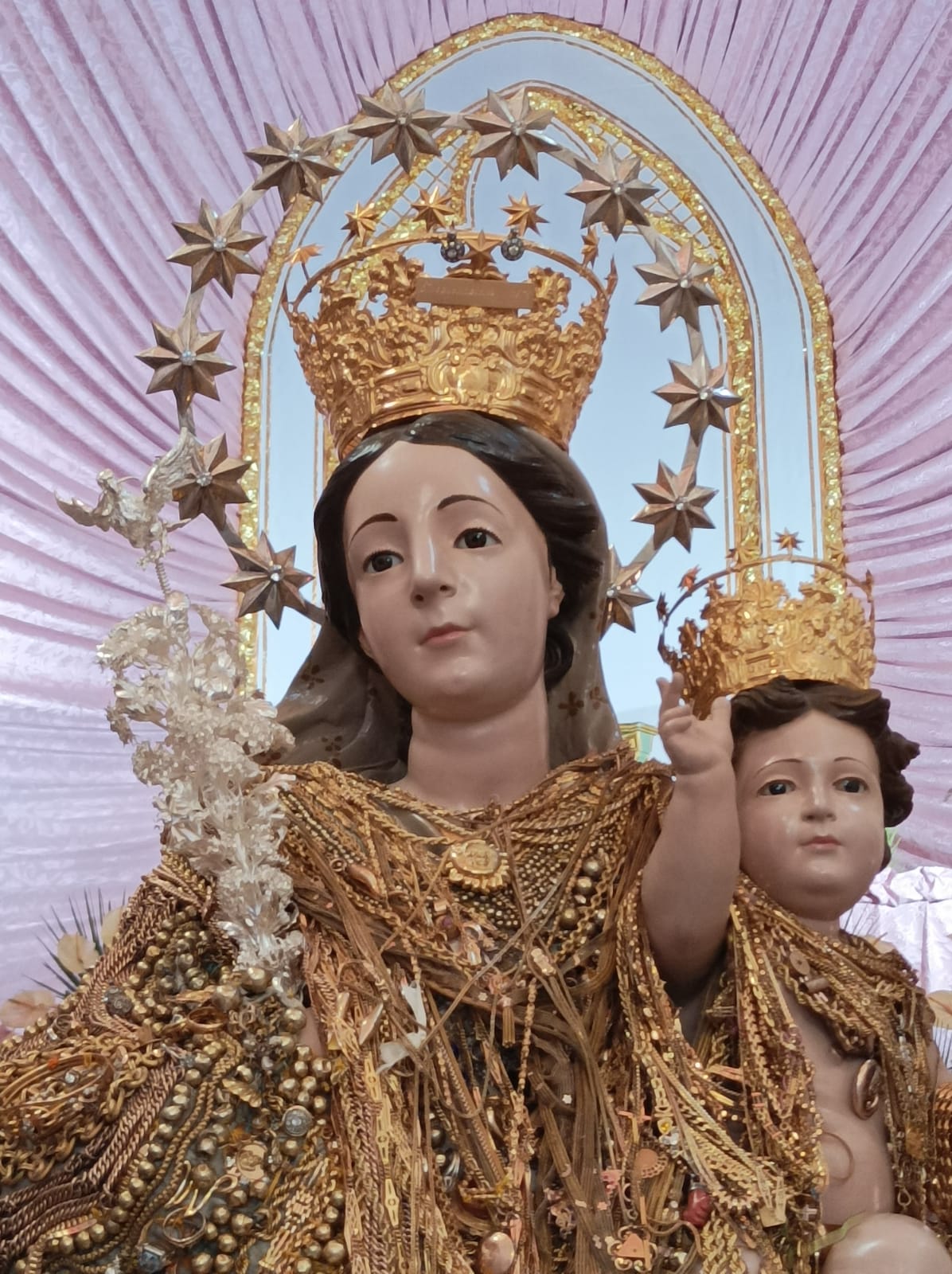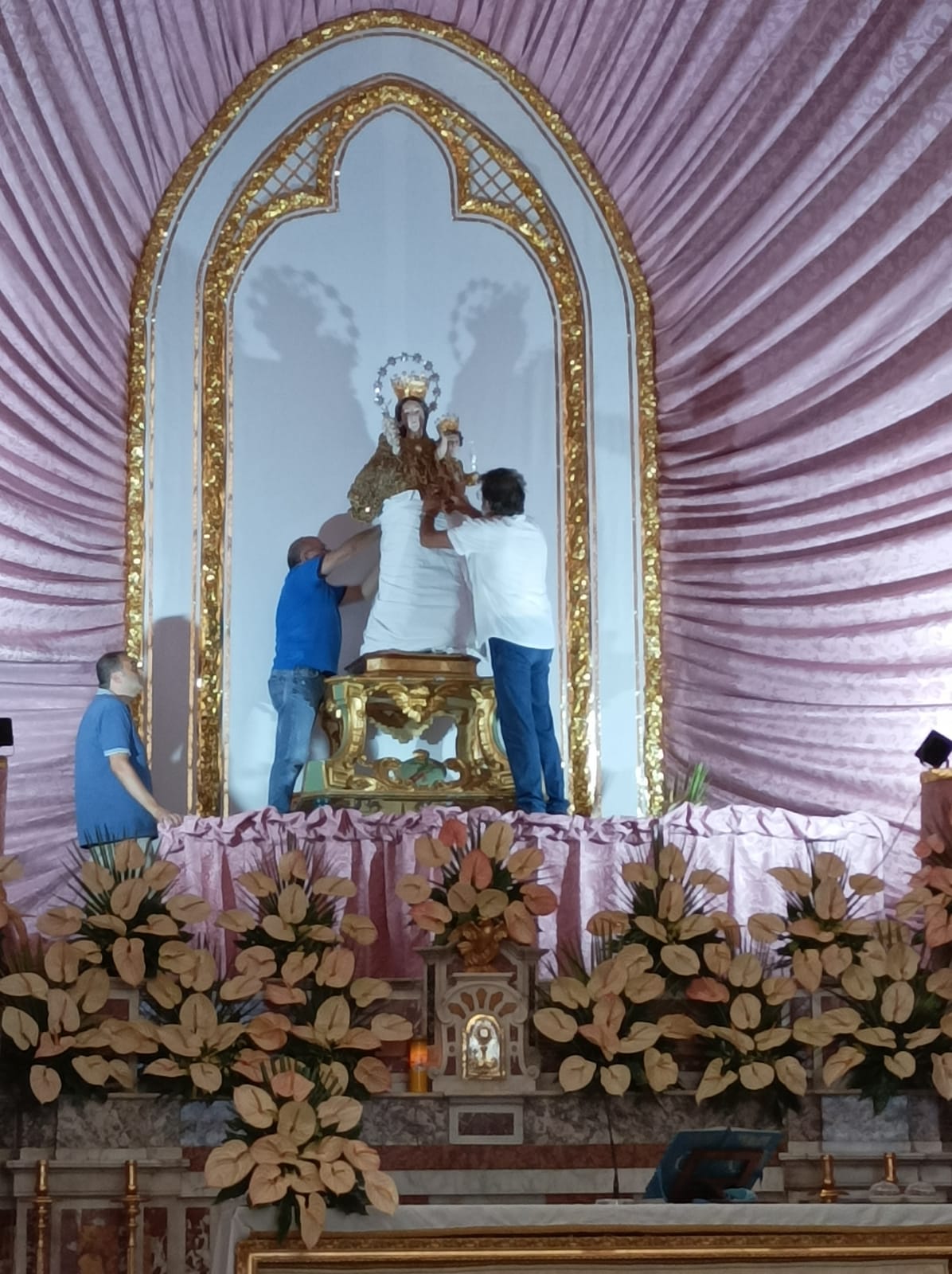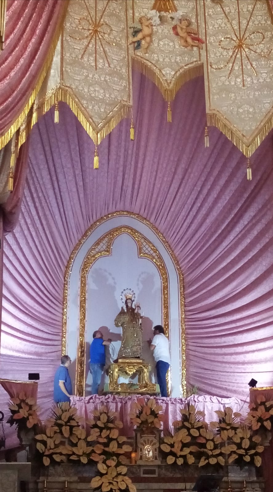Si è svolta stasera a Marzano di Nola la processione di Maria Santissima dell’Abbondanza tutta vestita d’oro. La Statua della Madonna è uscita dalla chiesa di San Trifone ove era stata collocata sabato scorso. Come da tradizione la processione si svolge in quattro giorni: l’ ultimo sabato di luglio Maria Santissima dell’Abbondanza esce dal suo Santuario, preceduta da Sant’Antonio e Sant’Andrea, per strada le va incontro San Trifone. Il lunedì successivo Maria Santissima dell’Abbondanza viene portata per alcune strade del paese, il martedì la processione esce a mezzogiorno e vi partecipano i devoti provenienti da San Giuseppe Vesuviano. Il martedì poi alle 23 si tiene la svestizione ossia vengono tolti gli ex voti d’ oro che ricoprono la statua. Il mercoledì Maria Santissima dell’Abbondanza fa rientro nel Santuario omonimo. Presenti alla processione due bande musicali, le autorità ecclesiastiche, civili e militari oltre gli appartenenti alle varie associazioni ed i fedeli. (L. Carullo) Foto e video