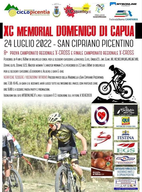 C’è attesa per lo svolgimento a San Cipriano Picentino del Memorial Domenico Di Capua in programma domenica 24 luglio. Inutile sottolineare l’impegno con cui il sodalizio Ciclo Picentia sta organizzando la manifestazione che chiude di fatto la stagione delle gare di mountain bike cross country in Campania sotto il marchio X-Country con annessa premiazione finale per agonisti, amatori e assegnazione delle relative maglie di campione regionale di specialità.