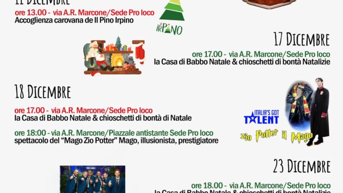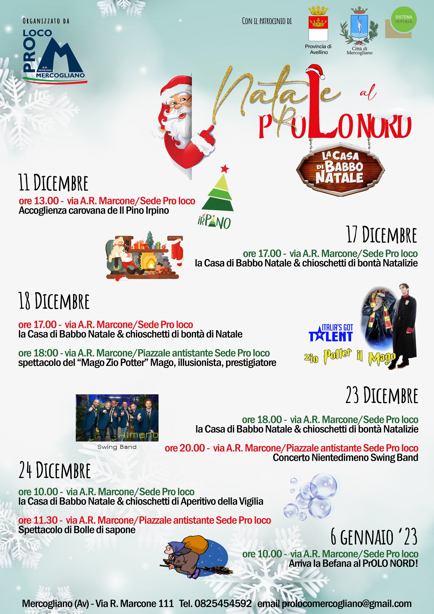 Sabato 17 dicembre, alle ore 17:00, è stato inaugurato a Mercogliano un week-end di intrattenimento e magia. Si inizia “Natale al pRolo nord” contenitore di eventi natalizi dedicati a tutta la famiglia ideato dalla Pro Loco Mercogliano e patrocinato dalla Provincia di Avellino e dal Comune di Mercogliano: una raccolta e magica casa di Babbo Natale, allestita all’interno della sede della Pro Loco, dove i bambini hanno potuto consegnare la letterina e incontrare Babbo Natale e all’esterno stands di degustazione e spettacoli di artisti di strada.
