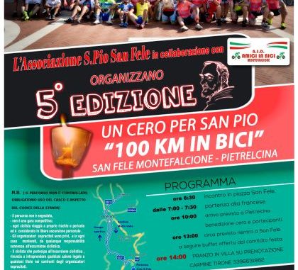 Dopo il successo riscosso nelle precedenti edizioni, torna puntuale l’appuntamento con “Un cero per San Pio”, la ormai tradizionale pedalata organizzata in occasione della Festa in onore di San Pio da Pietrelcina in c/da San Fele di Montefalcione. Per l’edizione 2019 il giorno scelto sarà quello di domenica 21 luglio. Un sempre crescente numero di appassionati delle due ruote si ritroverà nella piazza della frazione montefalcionese di buon mattino, per iniziare la pedalata che li porterà fino a Pietrelcina. Da San Fele di Montefalcione a Pietrelcina e ritorno la strada non è lunghissima: 100 chilometri per l’esattezza. Ma se a spingere è la passione che accomuna i componenti del gruppo ciclistico di Montefalcione “A.S.D. Amici in Bici” e i tanti amanti della bicicletta, allora le distanze si abbreviano ancora di più. Ma… come è possibile? “Siamo tutti amici, -risponde uno dei partecipanti- da marzo a novembre, in sella alle nostre bici percorriamo strade alla scoperta delle bellezze del territorio e questo ci rende felici!” Il programma della manifestazione: – Il ritrovo è previsto presso la piazzetta della c/da San Fele di Montefalcione a partire dalle ore 7.00, mentre la partenza sarà alle ore 7,30.  Arrivo a Pietrelcina alle ore 10,00 circa. Seguirà la benedizione del cero e, dopo un breve ristoro, ritorno a Montefalcione. Arrivo: ore 12,30 circa.  La statua di San Pio, ai piedi della quale sarà riposto il cero, farà da scenario allo scambio di doni tra gli organizzatori della festa in onore del Santo e della “A.S.D. Amici in Bici” e al rinfresco finale. Alle 14.00 è possibile partecipare al pranzo in Villa, con obbligo di prenotazione (contattare Carmine Tirone al 339 663 1862).