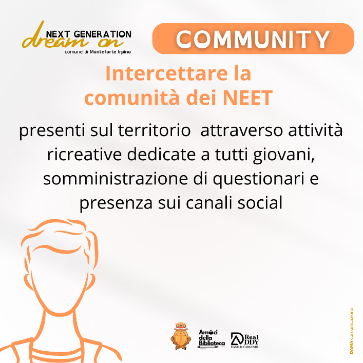 I 5 Step – Il primo, chiamato “COMMUNITY” servirà ad individuare la platea di NEET attraverso una serie di attività rivolte ricreative dedicate a tutti i giovani del territorio e all’utilizzo dei social network.