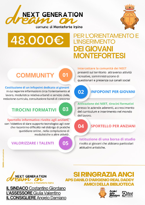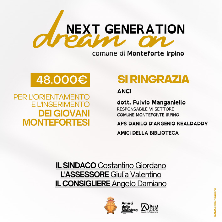 NEXT generation, dream on: è questo il nome del progetto fortemente voluto dall’amministrazione comunale di Monteforte Irpino e finanziato da ANCI per un importo complessivo di € 41.500, a cui si sommano i 1500€ messi a disposizione dall’associazione Danilo D’Argenio RealDaddy per la valorizzazione dei talenti locali e i 5000€ di cofinanziamento.