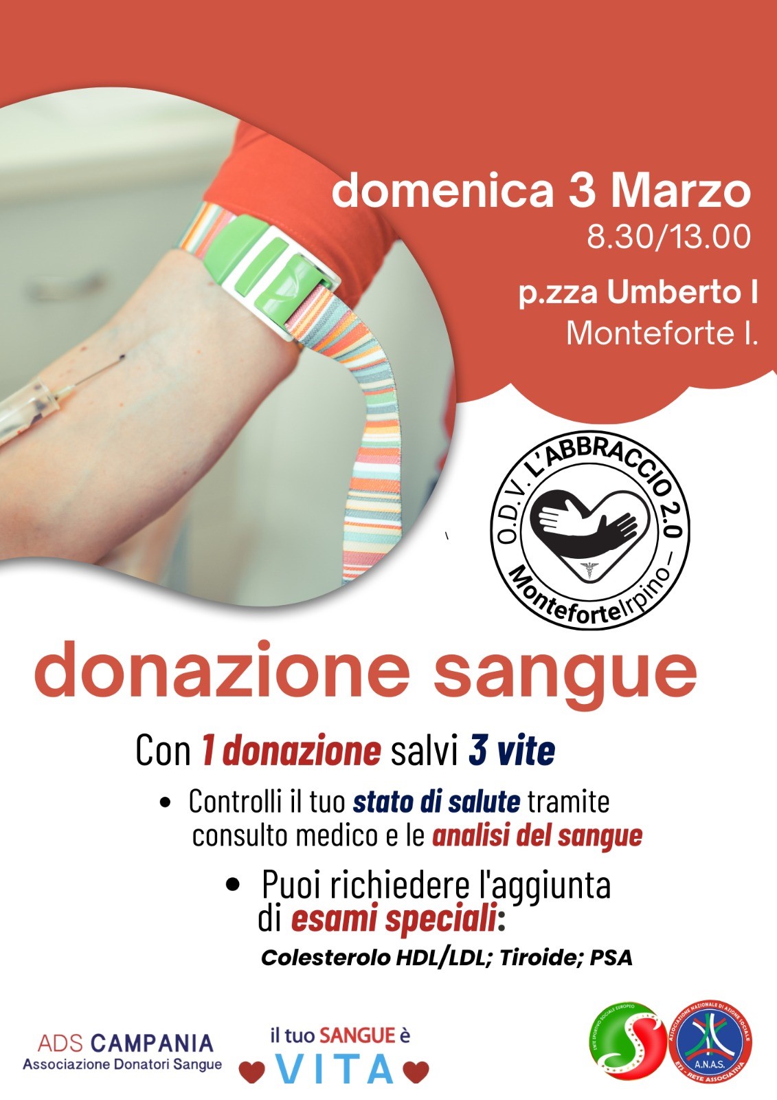 Il prossimo 3 marzo, la piazza Umberto I a Monteforte Irpino sarà il cuore di un evento significativo organizzato dall’Associazione O.D.V. “L’Abbraccio 2.0”: una giornata dedicata alla donazione del sangue, un gesto che va oltre la generosità, diventando un atto vitale per la comunità.