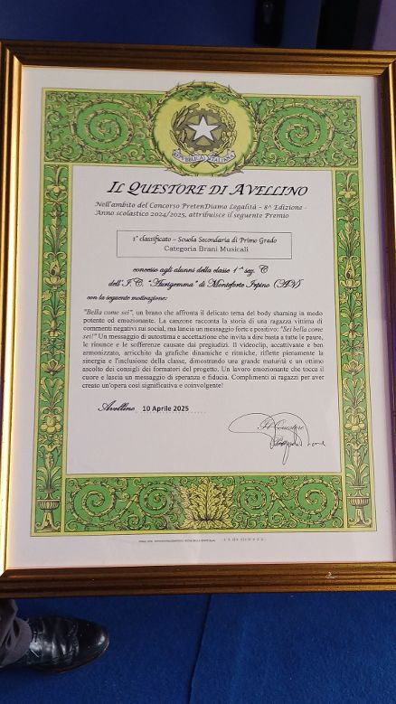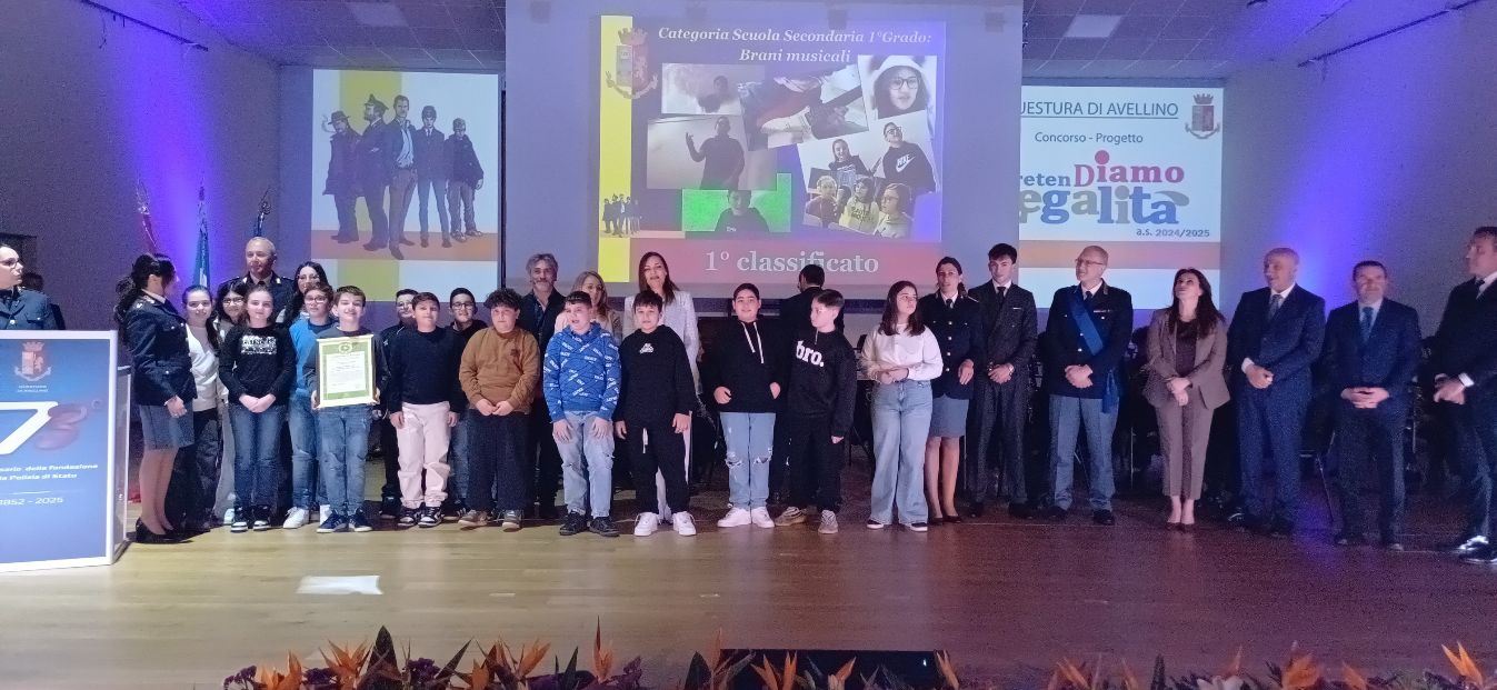 “Un messaggio di autostima e accettazione che invita a dire basta a tutte le paure, le rinunce e le sofferenze causate dai pregiudizi”. E’ quello che arriva dal videoclip “Sei bella come sei”, realizzato dagli studenti della 1 C della secondaria di primo grado dell’IC Aurigemma di Monteforte, con il coordinamento dei docenti Maria Sfera e Lorenzo Petruzziello, vincitore del primo premio all’ottava edizione del concorso “PretenDiamo legalità” promosso dalla Polizia di Stato. Un concorso nato dalla volontà di trasmettere agli studenti il valore della legalità come impegno quotidiano, preceduto da una serie di incontri di formazione nelle scuole, che ha visto la partecipazione di 22 istituti della provincia per un totale di 187 elaborati. Questa mattina, al Conservatorio Cimarosa, la cerimonia di premiazione in occasione della festa 173° anniversario della Poliza di Stato. A fare gli onori di casa il questore Pasquale Picone che ha ringraziato gli studenti “perchè siete sempre al nostro fianco”. Applauditissimo anche Luca Abete che ha ricordato come “il Codice della strada sia uno spartito necessario per garantire l’armonia degli strumenti dell’orchestra”. Particolarmente emozionante il momento della premiazione che ha visto salire sul palco gli studenti, guidati dai docenti Sfera e Petruzziello e dalla dirigente Filomena Colella. Particolarmente apprezzata la capacità di affrontare il tema del bodyshaming “In modo potente ed emozionante”. “Il videoclip, accattivante e ben armonizzato – si legge nella motivazione del premio – arricchito da grafiche dinamiche e ritmiche, riflette pienamente la sinergia e l’inclusione della classe, dimostrando una grande maturità. Un lavoro che tocca il cuore e lascia un messaggio di speranza e fiducia”. A premiare gli studenti l’Ispettore della Polizia di Stato Velia Giorgione che ha spiegato come la commissione sia stata profondamente colpita da quel brano “E’ il segno di come abbiate compreso appieno che cosa significa appartenere a un gruppo. Avete vinto anche nella vita”. E poi tutti a cantare in coro il ritornello, durante la proiezione del video, al termine della cerimonia. A comporre la commissione che ha valutato i lavori, presieduta dal questore Pasquale Picone, il vicario Marcello Castello, Rocco Rafaniello, primo dirigente, Giuseppe Bisogno, dirigente in quiescenza, l’Ispettore Angela Luisa Lomazzo, l’Ispettore Velica Giorgione, il Vice Ispettore Manuela Carrella, Pietro Ciafardini, la dirigente scolastica Giuseppina Cafasso, la professoressa Clementina Piantedosi. Per gli allievi anche i complimenti del Provveditore Fiorella Pagliuca. Ed ora ad attendere i bravissimi allievi dell’IC Aurigemma una nuova sfida, il loro videoclip concorrerà alla fase nazionale del concorso.