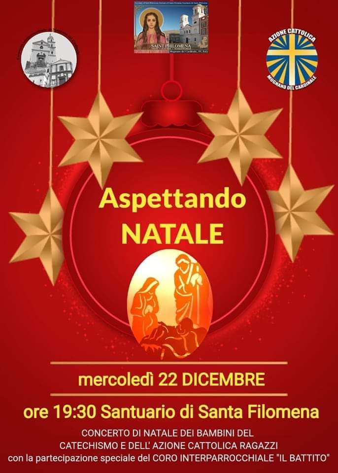 I bambini del Catechismo e dell’ Azione Cattolica ragazzi, con la partecipazione speciale del coro interparrocchiale “Il Battito”, sono lieti di invitare tutti, al concerto di Natale che si terrà mercoledì 22 dicembre, alle ore 19:30, nel Santuario di Santa Filomena per allietare con canti e poesie natalizie.