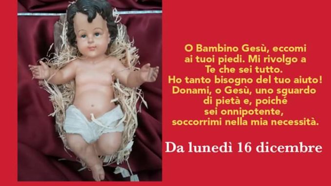 Mugnano del Cardinale – Domani inizierà la Novena al Bambino Gesù 15/12/2019 binews.it ATTUALITA', EVIDENZA, MUGNANO DEL CARDINALE 0 Domani 16 dicembre inizierà la Novena al Bambino Gesù. Le messe saranno celebrate alle 17 nella chiesa di San Michele Arcangelo e alle 18.30 nella parrocchia di Maria Santissima del Carmine e San Liberatore.