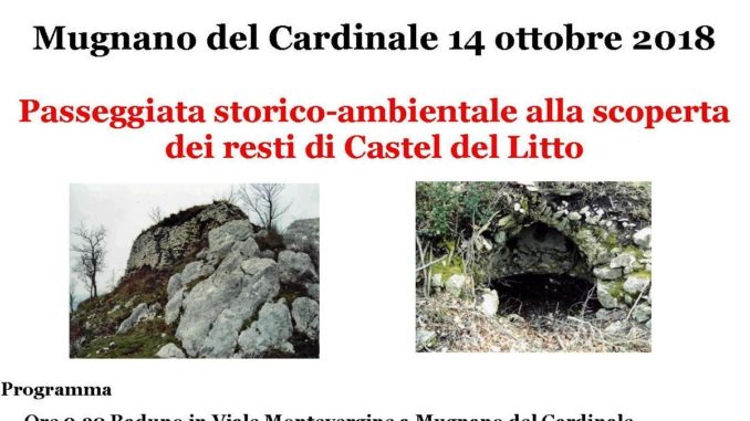 MUGNANO del CARDINALE. Alla scoperta dei resti di Castel del Litto, ecco la passeggiata storico ambientale 10/10/2018 binews.it ATTUALITA', EVIDENZA, MUGNANO DEL CARDINALE 0 Domenica 14 ottobre on occasione delle Giornate Nazionali di Archeologia Ritrovata a Mugnano del Cardinale si terrà una passeggiata storica – ambientale alla scoperta dei resti di Castel del Litto. Ecco il programma