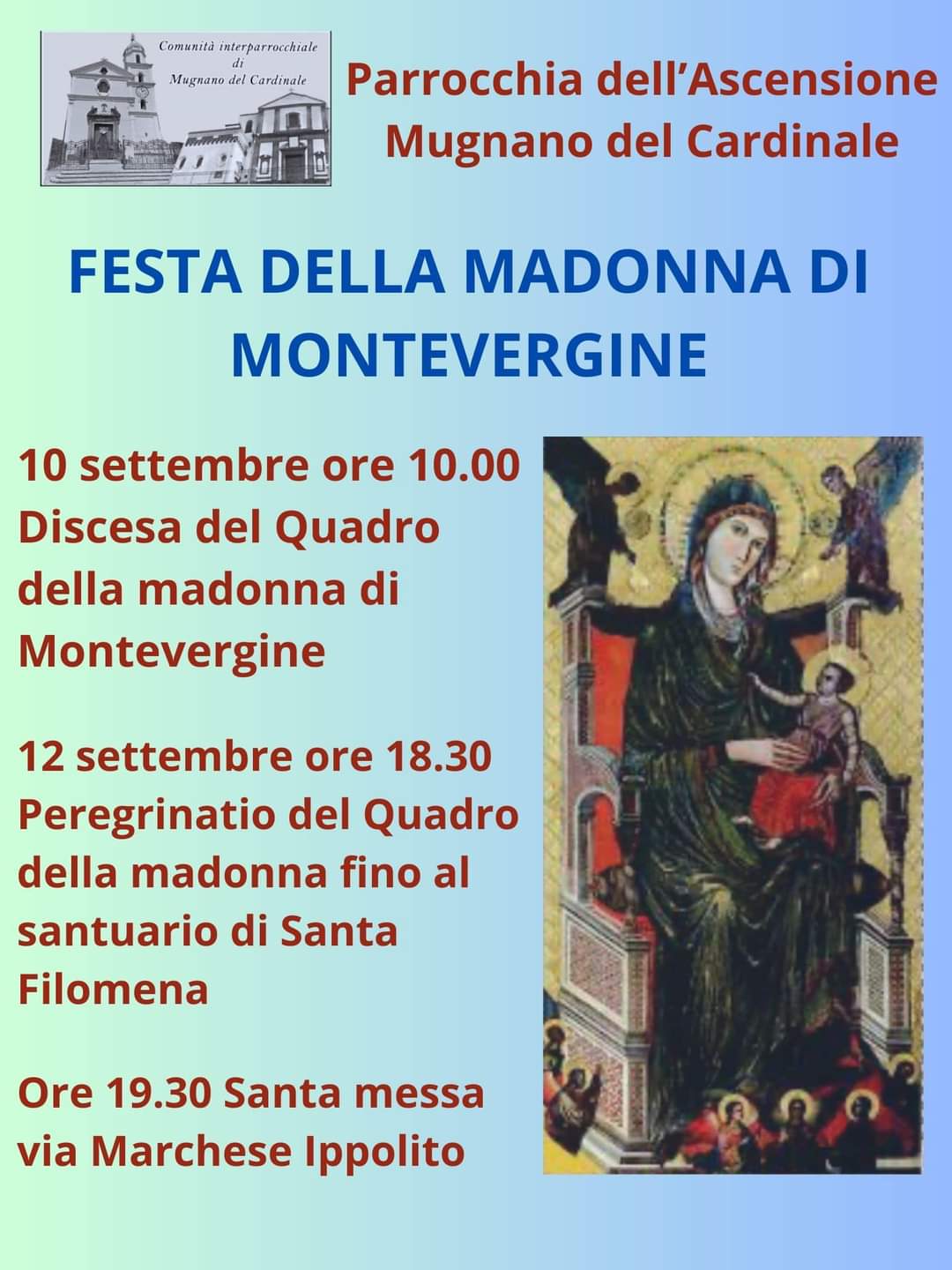 I mugnanesi hanno una profonda fede mariana e anche quest’anno renderanno omaggio a Mamma Schiavona. Domenica 10 settembre, alle ore 10 ci sarà la discesa del Quadro della Madonna di Montevergine. Il 12 settembre, alle 18.30 ci sarà la Peregrinatio del Quadro della Madonna fino al Santuario di Santa Filomena e alle 19.30 sarà celebrata la Santa Messa in via Marchese Ippolito.(L.C.)