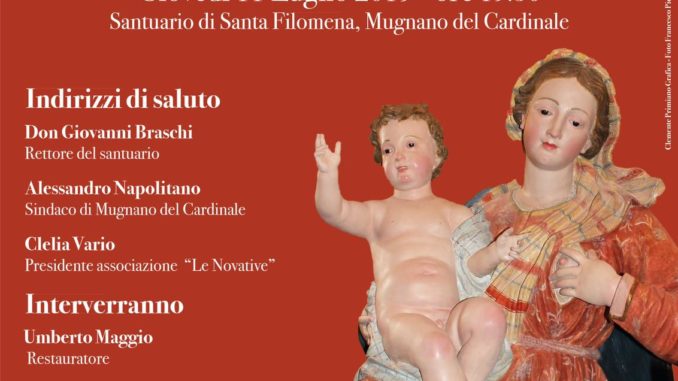 Nel pomeriggio di giovedì 11 luglio alle 19,30 presso il Santuario di Santa Filomena a Mugnano del Cardinale sarà illustrato il lavoro di restauro effettuato alla statua della Madonna delle Grazie. Inteveranno il Rettore don Giovanni Braschi, il sindaco di Mugnnao del Cardinale Alessandro Napolitano, la presidente dell’associazione Le Novative Clelia Vario. Ad illustrare i lavori il restauratore Umberto Maggio, Antonia Solpietro, ufficio beni culturali diocesi di Nola e Rosa Carafa, funzionario storico dell’arte. A moderare i lavori Elisabetta Vitale archeologa.