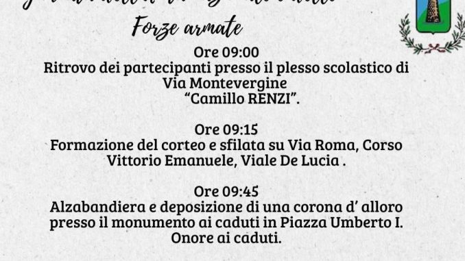Alle 9:15 è in programma la formazione del corteo, che sfilerà lungo Via Roma, Corso Vittorio Emanuele e Viale De Lucia fino a Piazza Umberto I, dove alle 9:45 si terrà l’alzabandiera e la deposizione di una corona d’alloro al monumento ai caduti.