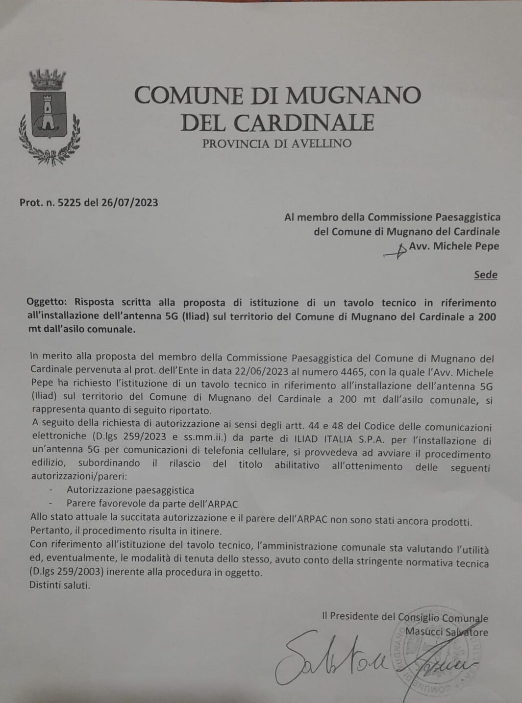 L’ avv. Michele Pepe avendo ricevuto risposta in merito all’istituzione di un tavolo tecnico (come da lui richiesto) per l’installazione dell’antenna 5G, continua la sua battaglia.