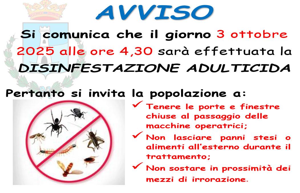 Il Comune di Mugnano del Cardinale informa la cittadinanza che nella giornata di venerdì 3 ottobre 2025, a partire dalle ore 4:30 del mattino, verrà effettuato sul territorio comunale un intervento di disinfestazione adulticida con prodotti a base di cipermetrina.