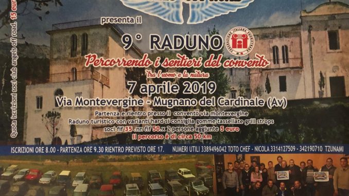 Si terrà domenica 7 aprile il consueto raduno annuale organizzato dal gruppo di appassionati di fuoristrada “Angels-Off Road”, giunto alla nona edizione, dal titolo “Percorrendo i sentieri del Convento – tra l’uomo e la natura”. L’appuntamento è fissato per i partecipanti alle ore 8,00 subito dopo seguirà la Santa Messa e poi l’inizio della manifestazione. Il percorso da attraversare è di circa 50 chilometri e toccherà le bellezze ambientali del Partenio. Il raduno, che si svolgerà a road book, interesserà i territori dei comuni di Mugnano del Cardinale, Sirignano, Quadrelle e Summonte. Il percorso è di media difficoltà, con varianti hard (facoltative) ed è adatto a tutti i fuoristrada con ridotte e con dotazioni di base quali gomme da fango, radio CB, trip-master, accessori per il recupero.