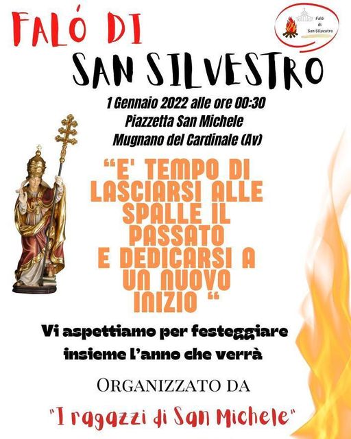 MUGNANO DEL CARDINALE. Ecco il falò di San Silvestro organizzato dai giovani 15/12/2021 binews.it ATTUALITA', EVIDENZA, MUGNANO DEL CARDINALE 0 I ragazzi di San Michele sono pronti a festeggiare l’arrivo del nuovo anno con il Falò di San Silvestro che si terrà il 1 gennaio 2022 alle 00,30 in piazza San Michele a Mugnano del Caridnale.