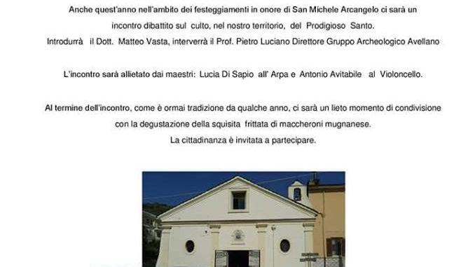 Il 28 settembre, alle ore 18, nella chiesa di San Michele Arcangelo si terrà un convegno sul culto del Santo. L’evento è organizzato dalla pro loco Rimettiamoci Insieme, introdurrà il dott. Vasta e interverrà il prof. Pietro Luciano, ci sarà anche un accompagnamento musicale. Al termine ai presenti sarà offerta la famosa frittata di pasta mugnanese.