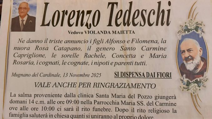 MUGNANO DEL CARDINALE – La comunità piange la scomparsa di Lorenzo Tedeschi, venuto a mancare all’affetto dei suoi cari all’età di 85 anni. Vedovo di Violanda Maietta, Lorenzo era figura stimata e conosciuta nel paese.
