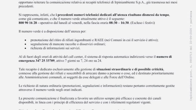 Irpiniambiente precisa che le richieste ordinarie dovranno continuare a essere effettuate tramite il numero verde negli orari indicati, al fine di garantire una gestione più efficiente e organizzata del servizio.