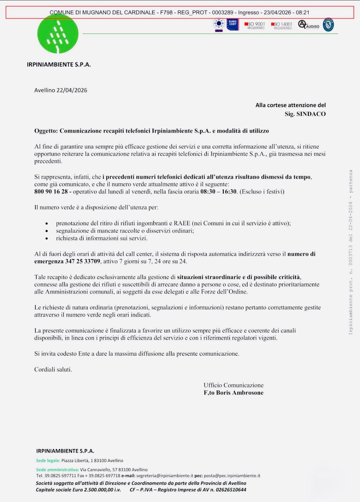 Il Comune di Mugnano del Cardinale informa la cittadinanza in merito a una comunicazione ufficiale di Irpiniambiente S.p.A. riguardante l’aggiornamento dei recapiti telefonici e delle modalità di contatto per i servizi.