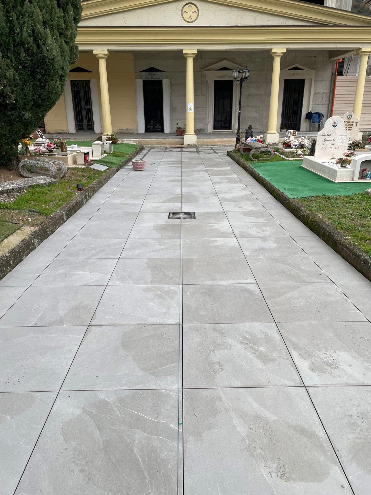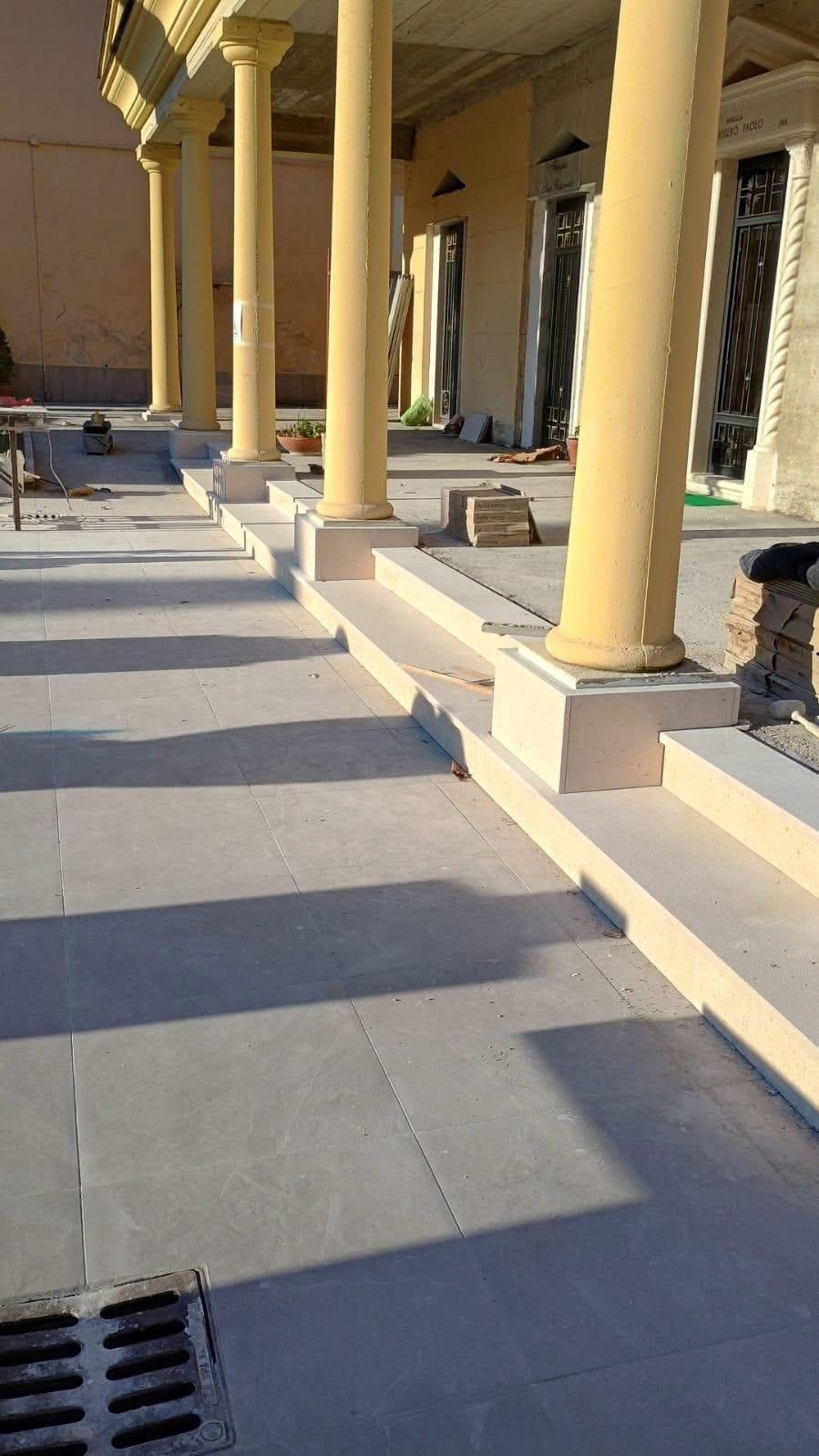 Tra gli interventi in corso figurano l’installazione di una nuova pavimentazione in gres porcellanato antiscivolo nei vialetti e nelle aree comuni, il rifacimento dei porticati e la realizzazione di scale in marmo di Trani chiaro, con finiture levigate e superfici antiscivolo. Opere pensate non solo per la funzionalità, ma anche per garantire un ambiente più armonico e rispettoso della sacralità del luogo.