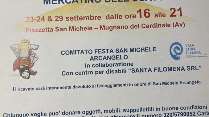 Il 24, 24 e 29 settembre, in onore della festa organizzata per San Michele Arcangelo, quest’anno si svolgerà un mercatino dell’usato in collaborazione con i ragazzi della RSA “Villa Santa Filomena”. L’importanza di rendere questi ragazzi sempre più parte integrante di un territorio che li ospita da tempo e del quale si sentono a tutti gli effetti “figli” si coniuga perfettamente con le tradizioni, la religione e la fede. La piccola cappella di San Michele, che probabilmente non tutti conoscono, è situata proprio accanto alla struttura ed i ragazzi sentono, da sempre, una speciale vicinanza a questo Santo, così come accade per Santa Filomena. Come si evince dalla locandina, il ricavato sarà utilizzato per tutto ciò che occorre nell’organizzazione, appunto, della festa. Nel frattempo, in attesa dei giorni che verranno, i cittadini non solo di Mugnano del Cardinale, ma di tutto il mandamento, a collaborare, quando possibile, donando oggetti di qualsiasi tipo. Per le donazioni è possibile rivolgersi al Comitato Festa San Michele, che si occuperà del ritiro. ( riferimento telefonico Sign. Carlo Vena 3205790052 ).