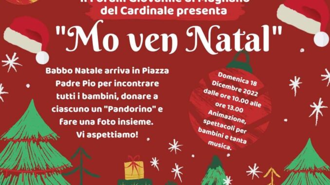 Domenica 18 dicembre, dalle 10.00 alle 13.00, in piazza Padre Pio si terrà la manifestazione “Mo ven Natal”. L’evento rientra tra le attività organizzate dal Forum Giovanile.