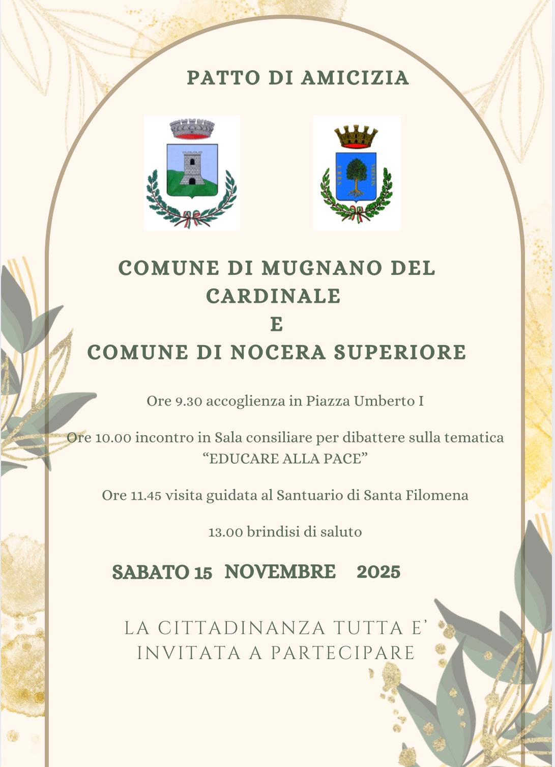 Prosegue il percorso di collaborazione tra il Comune di Mugnano del Cardinale e il Comune di Nocera Superiore, uniti dal Patto di Amicizia siglato nei mesi scorsi per promuovere iniziative condivise di carattere culturale e sociale.