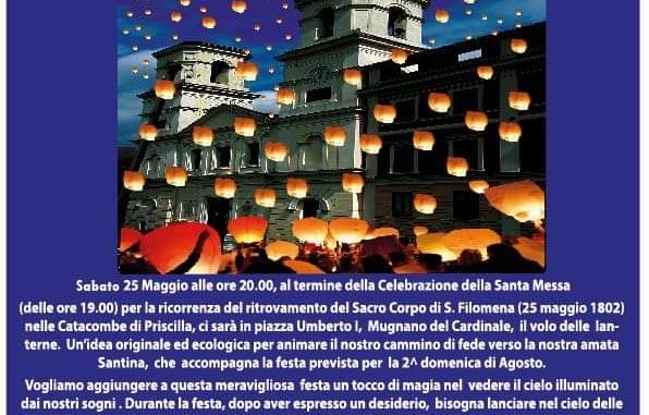 Sabato 25 maggio, alle ore 19, nel Santuario sarà celebrata la santa messa per ricordare il ritrovamento del corpo della Santina il 25.05.1882, nelle catacombe di Priscilla. Alle 20 tutti i fedeli si recheranno in piazza Umberto I, ove sarà deposta una corona di fiori e recitata una preghiera dinanzi alla statua del sacerdote De Lucia. In seguito ci sarà il lancio delle lanterne, chiunque vuole acquistarne una può recarsi presso la sede del Comitato Festa e Battenti Santa Filomena. Per concludere la serata ai presenti saranno offerti dei dolci.