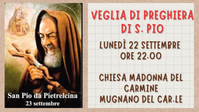 Questa sera, lunedì 22 settembre, alle ore 22.00, presso la Chiesa Madonna del Carmine di Mugnano del Cardinale, si terrà la tradizionale veglia di preghiera dedicata a San Pio da Pietrelcina, in occasione della sua memoria liturgica che ricorre il 23 settembre.