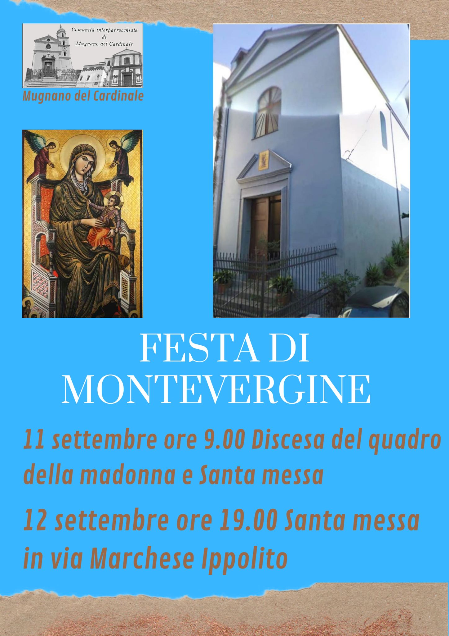 MUGNANO. Domenica 11 settembre “Festa di Montevergine” 06/09/2022 binews.it ATTUALITA', EVIDENZA, MUGNANO DEL CARDINALE 0 Domenica 11 settembre nella chiesetta di Montevergine alle ore 9.00 discesa del quadro della madonna e Santa messa. Lunedì 12 settembre ore 19.00 santa Messa in via Marchese Ippolito ( strada antistante alla chiesa di Montevergine).