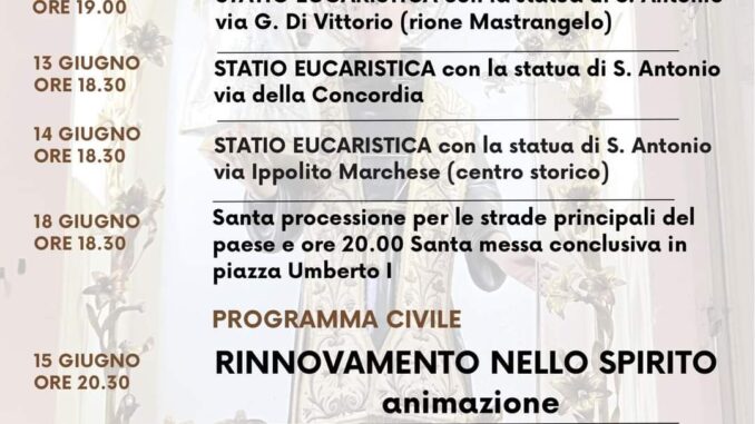 La Santa Processione si svolgerà domenica 18 giugno, a partire dalle ore 18 e saranno attraversate le strade principali del paese. Alle 20, in piazza Umberto I, sarà celebrata la messa, al termine ci sarà l’estrazione della lotteria e poi lo spettacolo dei fuochi pirotecnici.