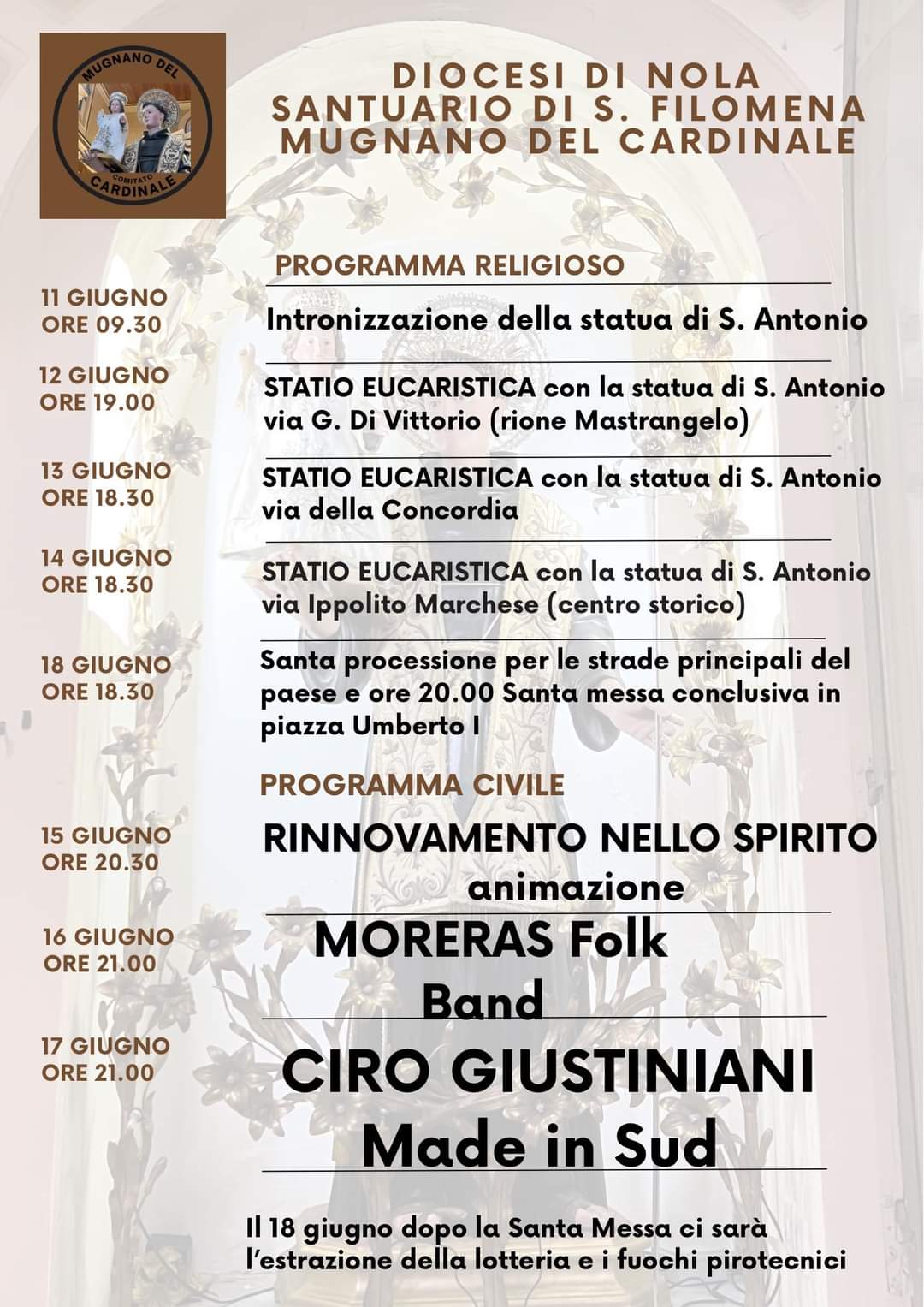 Il programma civile prevede l’animazione del Rinnovamento nello Spirito il 15 giugno, il 16 giugno si esibiranno i Moreras Folk Band e gran finale il 17 giugno con lo spettacolo, del noto comico, Ciro Giustiniani.