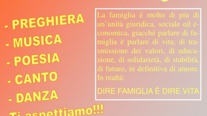 Dire famiglia è dire vita e con questo motto che tutti vengono invitati a partecipare alla “Festa della famiglia” che si terrà sabato 22 febbraio alle ore 20, nella Parrocchia dell’Ascensione. La serata sarà animata da canti, balli, poesie, musica e preghiera.