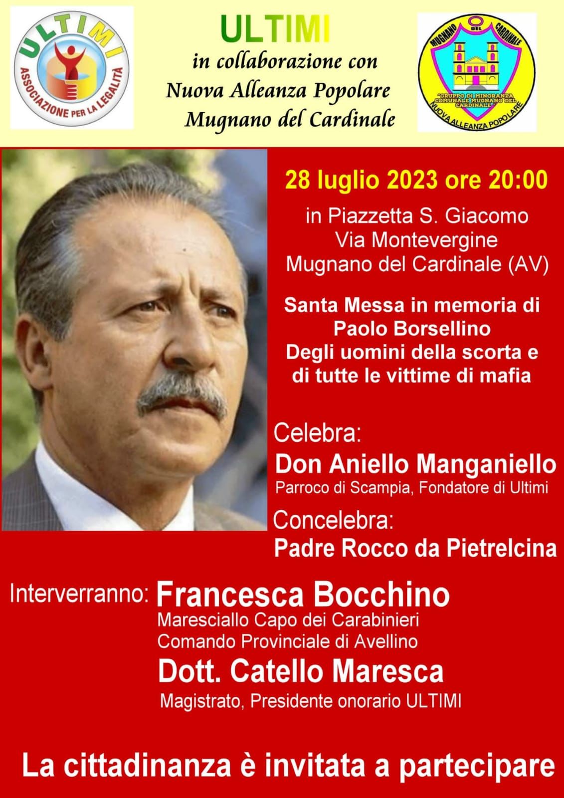 Mugnano   Il 28 luglio il magistrato Catello Maresca in paese per commemorare Paolo BorsellinoVenerdì 28 luglio, alle ore 20, in piazzetta San Giacomo si terrà una messa commemorativa in memoria del magistrato Paolo Borsellino, degli agenti della sua scorta e di tutte le vittime della mafia. La funzione religiosa sarà officiata da don Aniello Manganiello e concelebrata da Padre Rocco da Pietrelcina. Parteciperanno all’evento il maresciallo Francesca Bocchino e il magistrato Catello Maresca. La cittadinanza è invitata a partecipare.