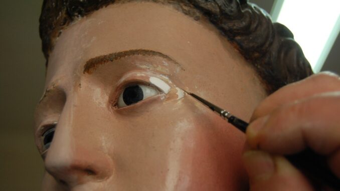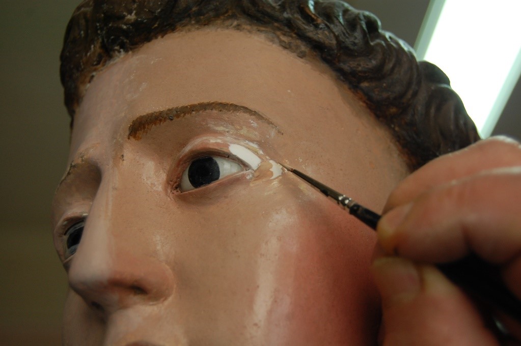 A questo punto si è proceduto alla realizzazione del collegamento pittorico delle lacune con acquerelli e tempere. La scultura è stata di nuovo verniciata a pennello con vernice mastice molto diluita. Con i colori a vernice sono stati raggiunti i toni definitivi.