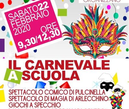 Spettacoli comici con animatori in maschera, dedicati ai bambini della Scuola dell’Infanzia e di tutte le classi della Scuola Primaria. Un gruppo di attori con Pulcinella ed Arlecchino, protagonisti assoluti con varie scenette comiche, la presenza del Teatrino dei burattini e di animatori che proporranno momenti di musica, canti e tanta allegria, faranno in modo da allietare l’ intera mattina di Sabato 22 Febbraio per condurre i bambini in un viaggio nel mondo della fantasia, del colore e della creatività, oltre il tempo e lo spazio. Un gruppo di animatori sarà presente presso il plesso della Scuola per l’Infanzia in Via S. Silvestro, mentre un altro gruppo presenterà lo spettacolo nei locali della Scuola Primaria in Via Montevergine.