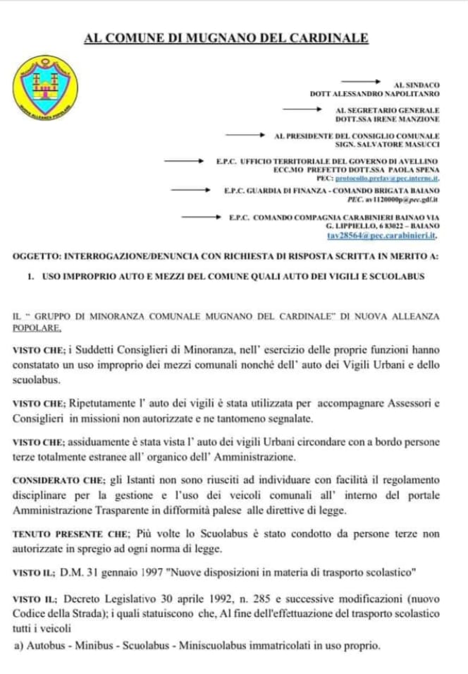 MUGNANO. Uso improprio di mezzi comunali, interrogazione e denuncia da parte di Nuova Alleanza Popolare MUGNANO. Uso improprio di mezzi comunali, interrogazione e denuncia da parte di Nuova Alleanza Popolare MUGNANO. Uso improprio di mezzi comunali, interrogazione e denuncia da parte di Nuova Alleanza Popolare