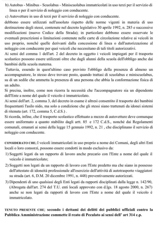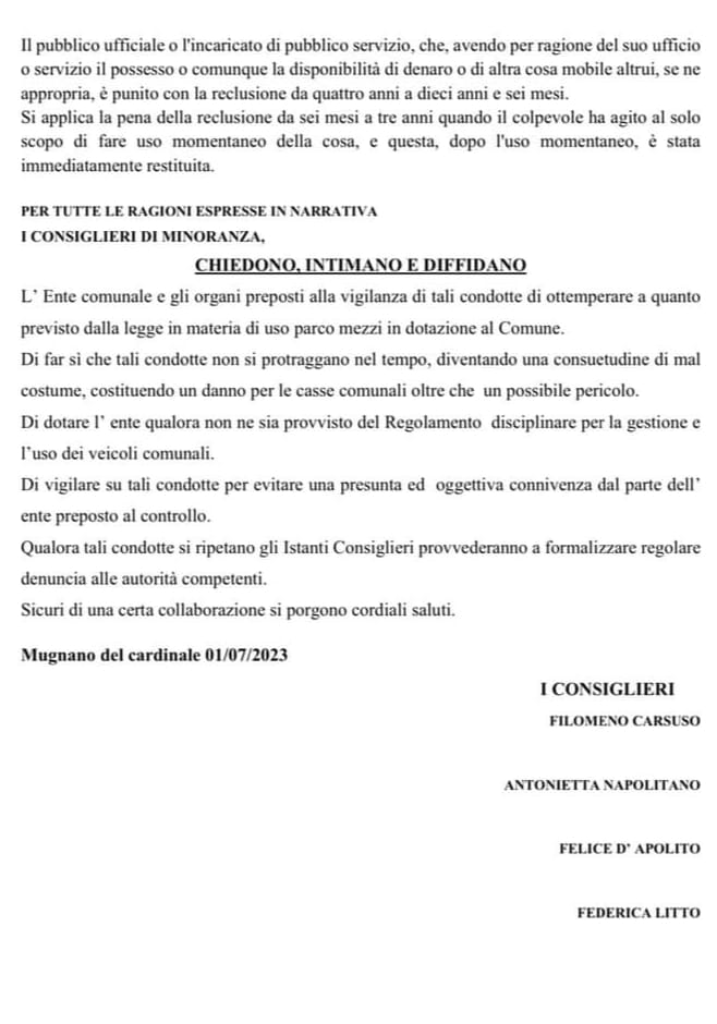 La minoranza richiede che l’ utilizzo dei mezzi in uso al Comune debba essere al più presto regolamentato per evitare che l’uso improprio dei predetti mezzi possa costituire oltre che un danno per le casse comunali anche un possibile pericolo.(  A. Siniscalchi)