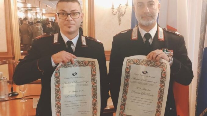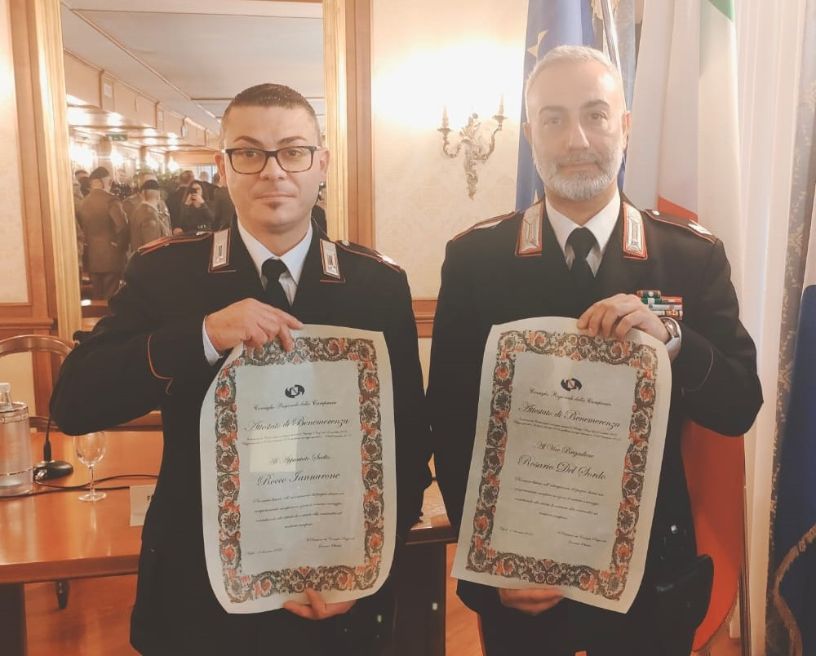 Come previsto dalla Legge Regionale n. 29/2003, modificata dalla L.R. n. 12/2015, sono stati premiati sei militari dell’Arma dei Carabinieri e sei militari dell’Esercito Italiano, scelti tra i più meritevoli per azioni di soccorso e di coraggio compiute nel contrasto alla criminalità, in servizio o fuori servizio, sul territorio regionale campano. Alla presenza dei familiari delle vittime dell’attentato di Nassiriya e di Autorità civili e militari, sono stati premiati anche il Vice Brigadiere Rosario Del Sordo e l’Appuntato Scelto Rocco IANNARONE, addetti alla Stazione Carabinieri di Ariano Irpino, con la seguente motivazione: